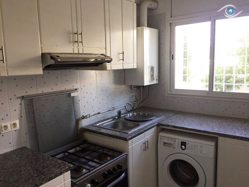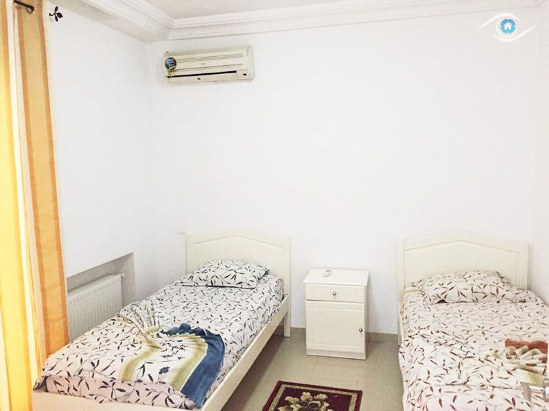 Vision Immobilière vous proposes,Cet appartement se dresse au rées de chausser d’une résidence gardée et bien entretenue dans un quartier calme. Près de toutes les commodités à Hammamet. L'entrée donne sur un salon et une salle à manger, cette pièce est lumineuse grâce à son balcon, qui donne une vue panoramique sur la colline d’Hammamet. La cuisine est aménagée et équipée d'une plaque, d'un four et d'une hotte aspirante. Un couloir nous mène à la partie nuit qui loge deux chambres à coucher munies chacune par un dressing et qui se partagent une salle de douche commune. Un abri de voiture est à votre disposition. L’appartement est entièrement équipé de chauffage central et de climatisations. Un abri qui peut contenir deux voitures.