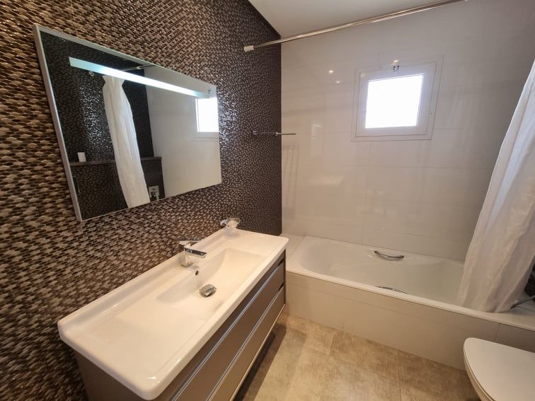 Cet appartement comporte un salon avec une terrasse vue sur mer, une cuisine équipée, trois chambres à coucher et deux salles de bains une avec une douche et l’autre avec une baignoire.