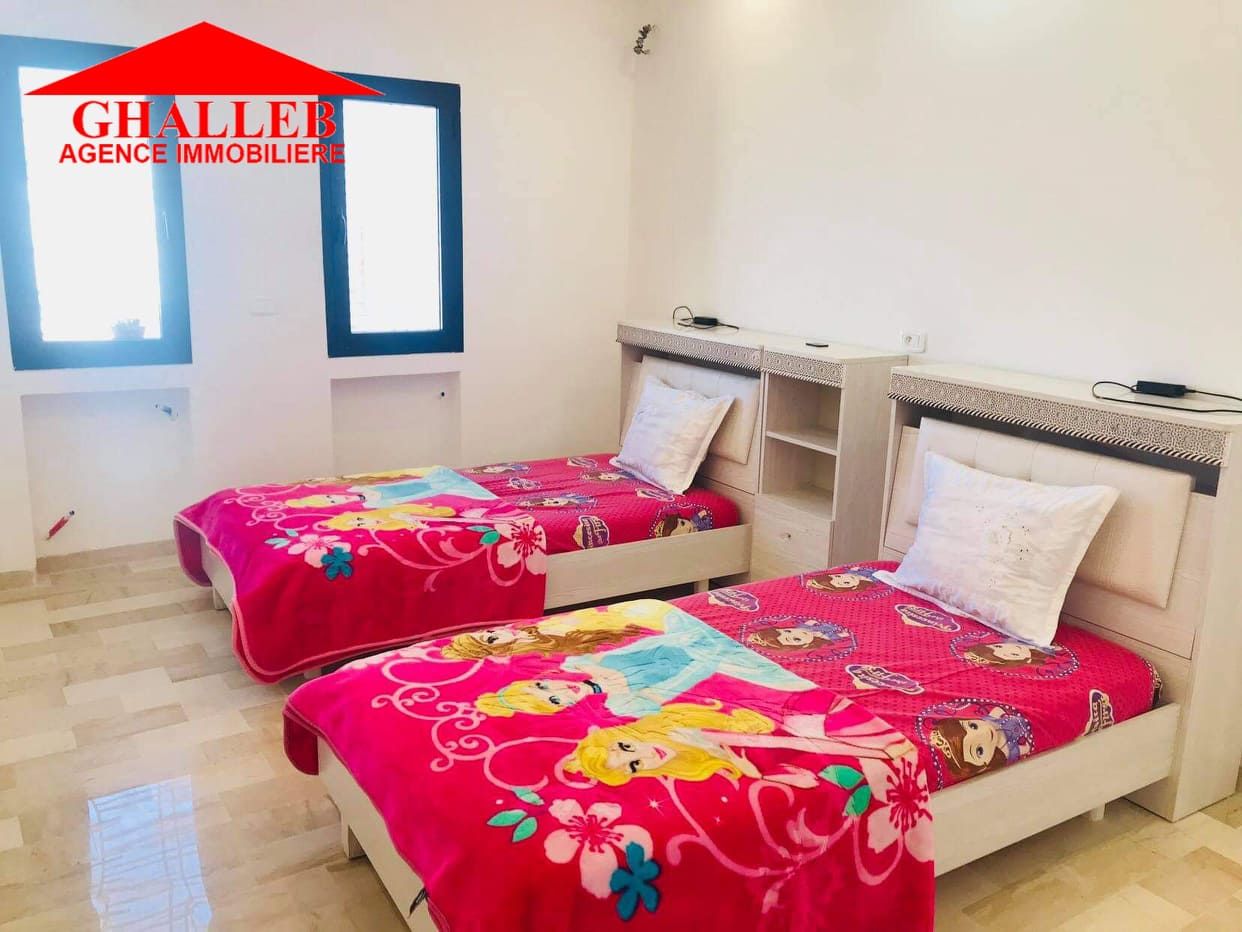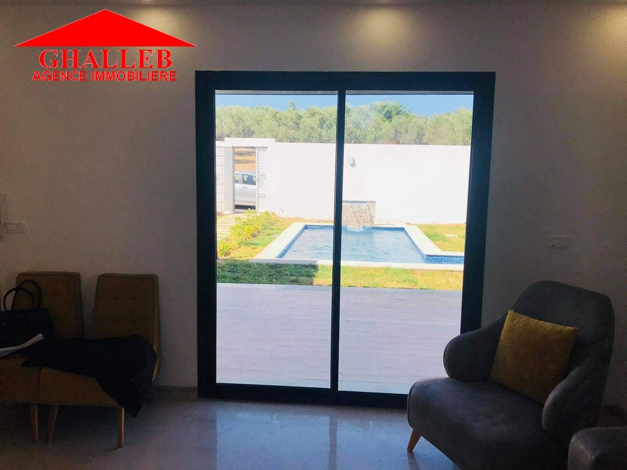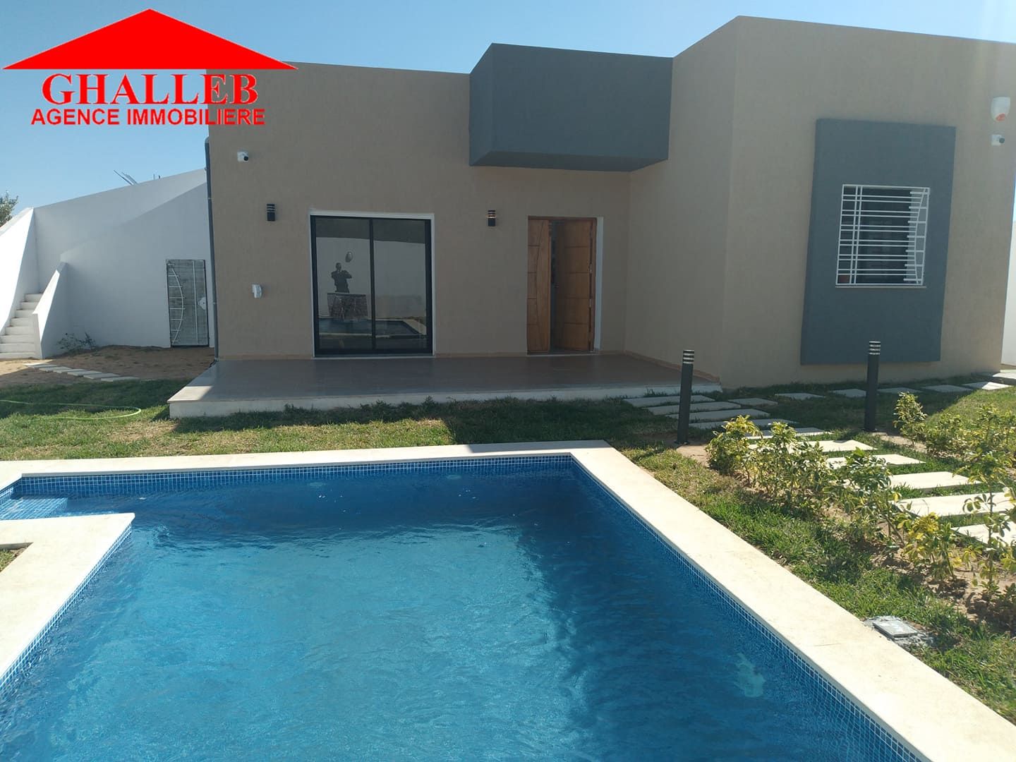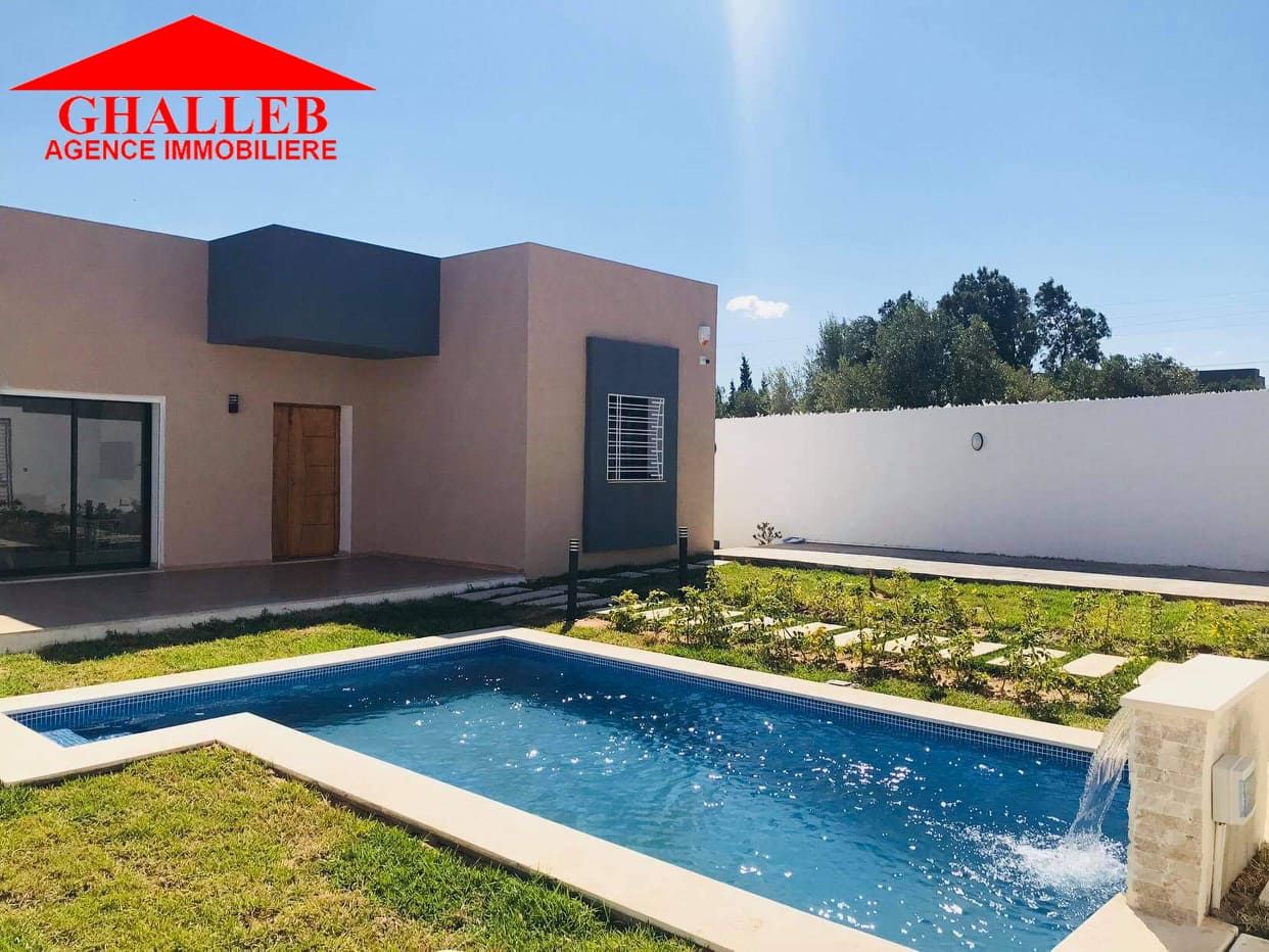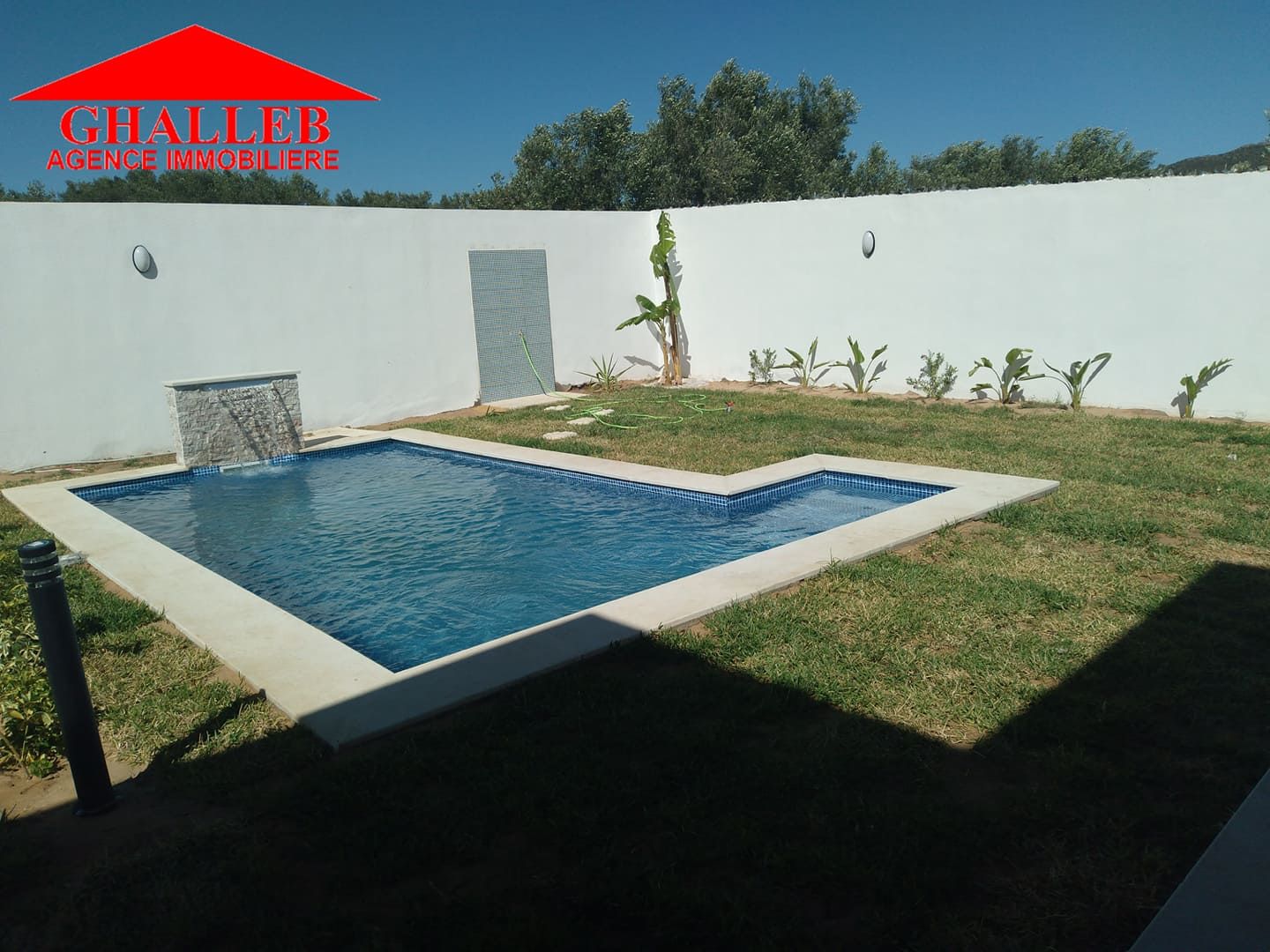 Une belle villa au plein pied, à la compagne d’Hammamet à 10 minutes en voiture de centre ville Hammamet L’endroit de la villa est magnifique ou le calme et la tranquillité. Elle se compose : un grand salon avec une belle terrasse ouverte sur la piscine, une cuisine, une salle d’eau 2 chambres à coucher avec une suite parentale contient d’une salle d’eau. Possibilité de construire en haut.