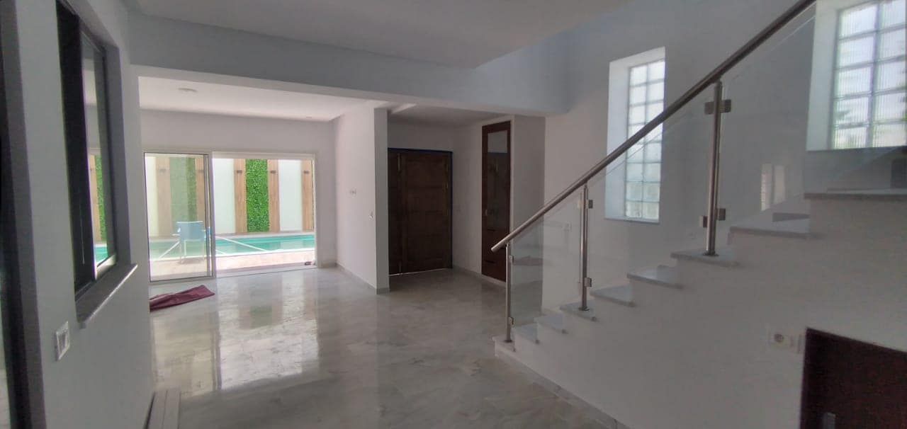 Elle se compose au RDC d'un salon vu piscine avec cuisine et une chambre a L'étage il ya deux chambres avec suite parentale.