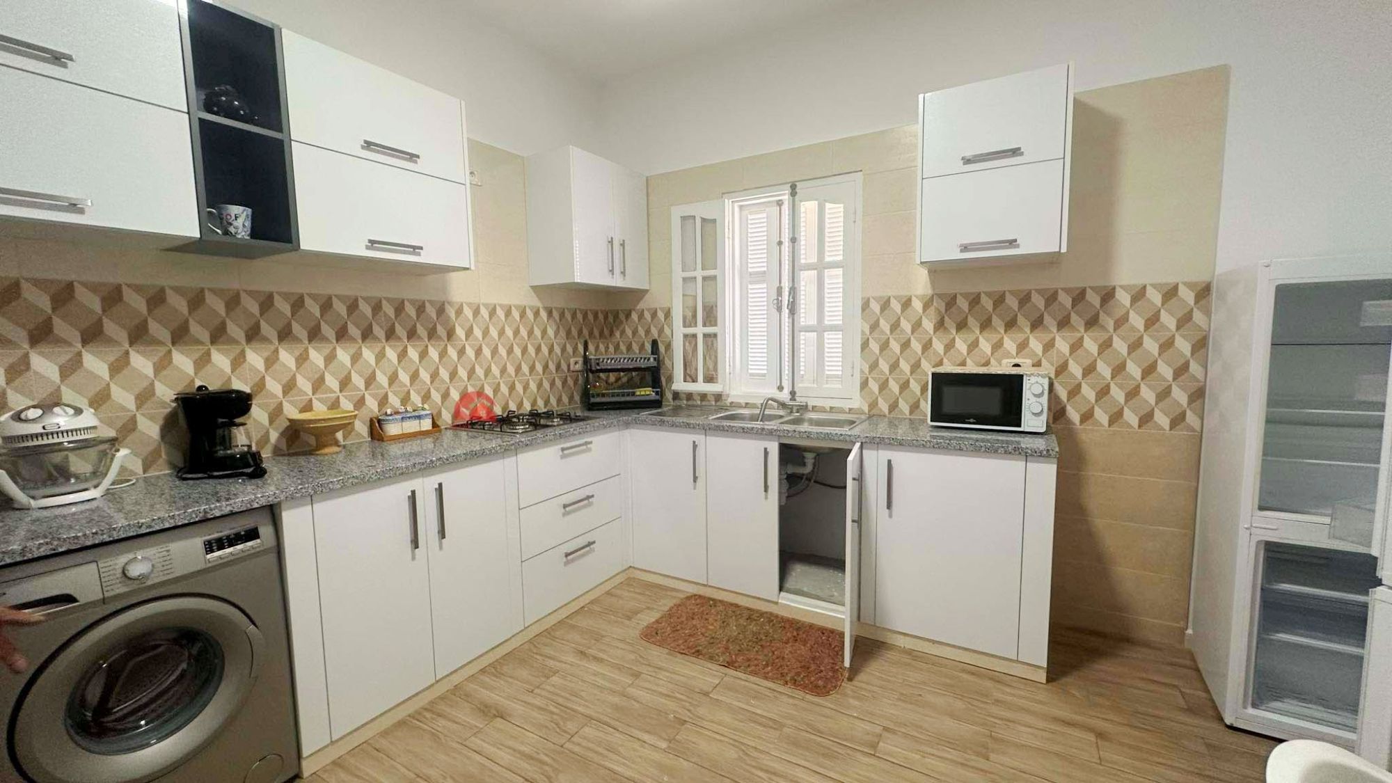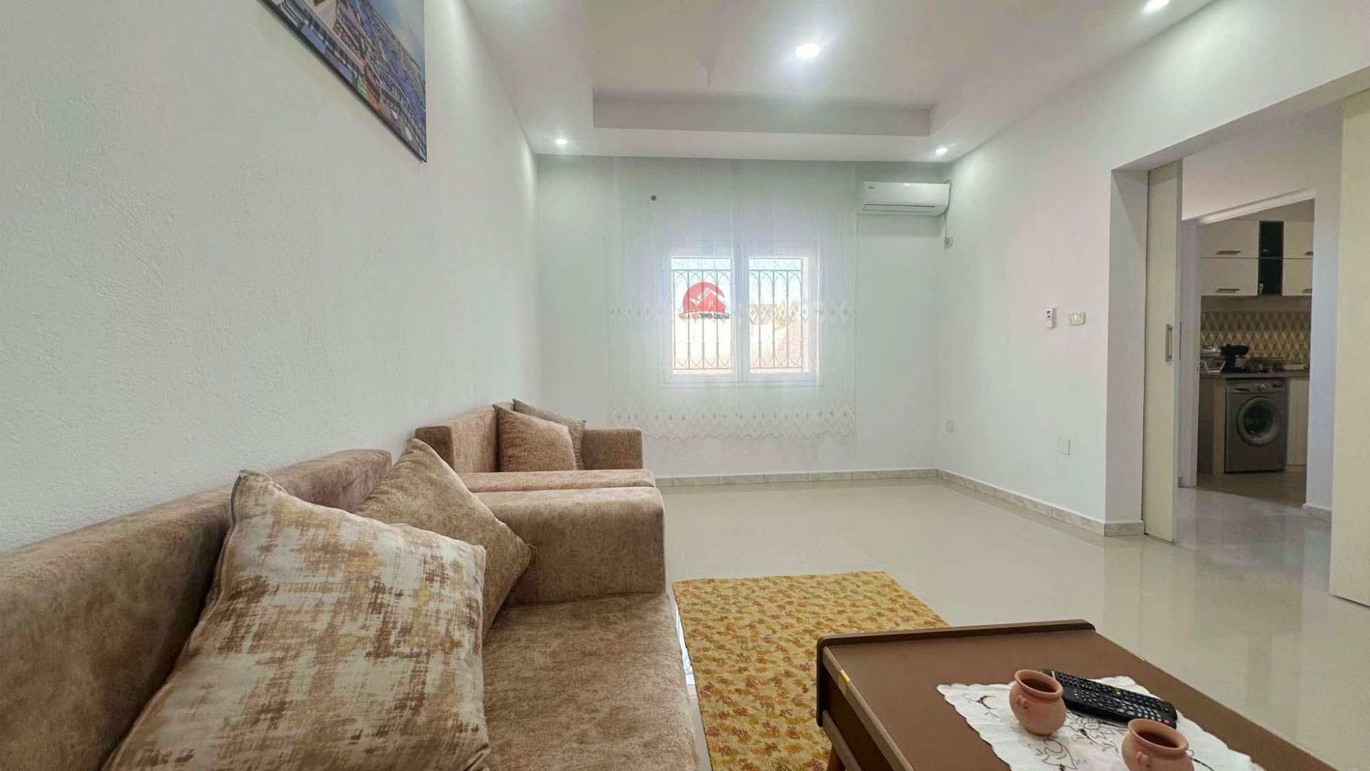 Une maison en rez de chaussée avec une entrée indépendante qui se compose d'un hall d'entrée, salon climatisé, 2 chambres, cuisine bien équipée et salle d'eau.