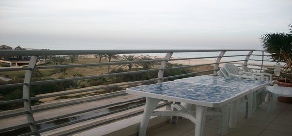 à Sousse en plein zone touristique , un joli appartement moderne meublé vue mer, au 4ème étage avec ascenseur, dans une résidence pied dans l'eau avec piscine, composé d'un salon avec grand terrasse vue mer et vue ville, deux chambres, cuisine bien équipée et aménagée, WC,salle de bain,chauffage central,climatisation .