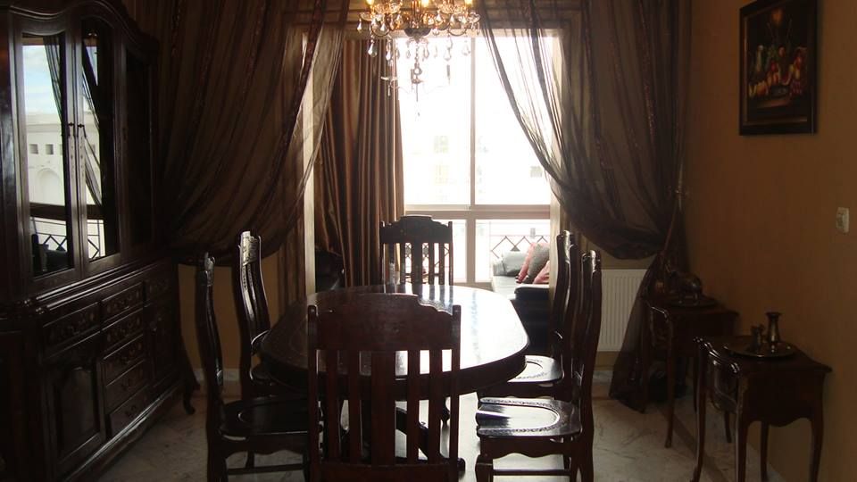 Cet appartement est situé au 4 ème ètage d'une résidence gardée. L'entrée donne sur un salon revêtu de marbre blanc, équipé d 'un salon egyptienne , une salle à manger, un coin salon au terrasse une table basse et une plasma. A droite on découvre une cuisine sèparèe, totalement équipée avec tout l’électroménager et la vaisselle nécessaire. La partie nuit est composée de deux chambres à coucher, la première est équipée d'un lit double,et la deuxième chambre d'un lit simple et un dressing. Ils se partagent une salle de bain. Un garage de voiture est disponible.