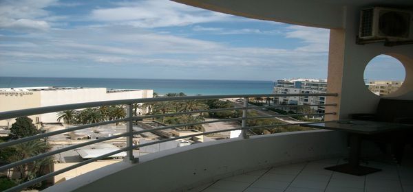 A Sousse En plein zone touristique ,et à deux pas de la plage,des restaurants et des hôtels un spacieux appartement semi meublé au 6eme étage d'une résidence de prestige composé d'un spacieux salon avec terrasse ayant une sublime vue mer ,deux chambres à coucher chacune avec balcon vue mer , suite parentale avec dressing,salle douche et ayant une terrasse avec une magnifique vue mer,salle douche italienne , salle d'eau ,cuisine agencée et bien équipée ,toute les pièces sont climatisées et chauffées,parking au sous sol ,l'appartement se vende en semi meublé .résidence gardée 24/24