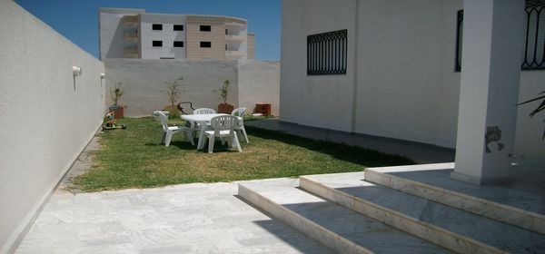 A khzema ouest une villa meublée composée d'un grand séjour,quatres chambres à coucher,salle de bain avec jacuzzi, salle d'eau ,cuisine bien equipée et agencée ,emplacement pour deux voitures ,un jardin tout autour de la villa, un studio pour la femme de ménage,chauffage central.