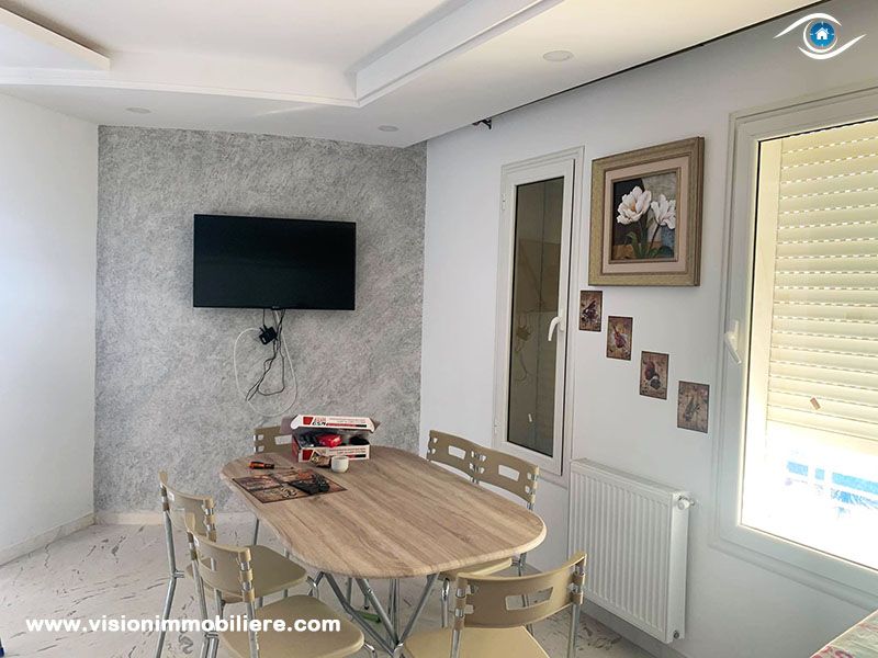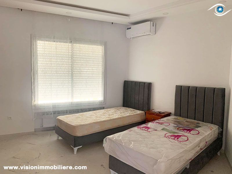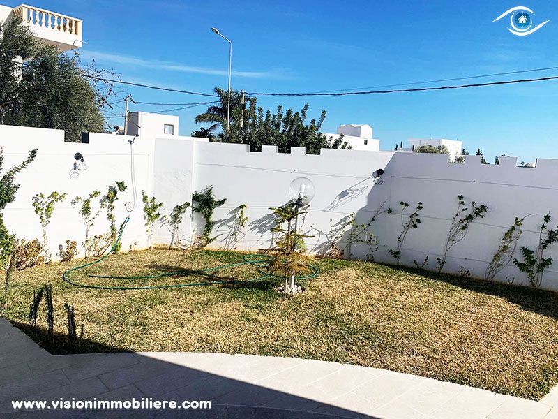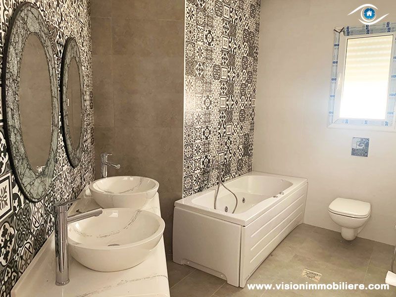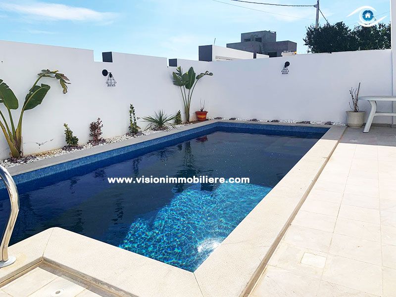 A vendre , Chez Vision Immobiliére Tunisie Hammamet , cette Villa spacieuse qui se situe à Hammamet nord . dans un quartier calme et à la fois résidentiel. L'entrée donne sur un piscine avec des debordement et un jardin . Le RDC se compose : L’entrée principale s'ouvre sur un salon lumineux , un séjour et une salle à manger . une salle de bain commune pour les invités . Une chambre à coucher . La cuisine agencée et aménagée par les éléments de rangements nécessaires . Un escalier nous méne au 1 er étage qui possède une suite parentale . deux chambres à coucher, meublées par des dressings . Elles se partagent une salle de douche commune . un garage est à la disposition qui peut contenir 2 voitures .