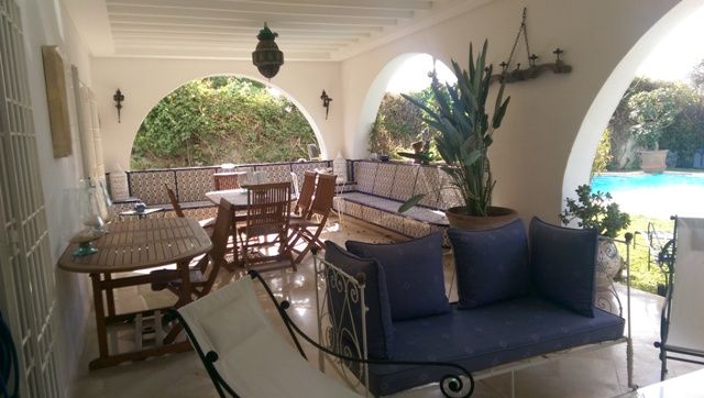 A chez l'agence TPS Immobiliere Hammamet, une somptueuse demeure érigée sur trois niveaux, bâtie au style arabo-contemporain avec des voûtes croisées et des arcades. Elle est située à Hammamet, dans un quartier verdoyant, calme et serein à 1 km environ de la plage. La villa offre un spacieux salon contenant un agréable coin de détente face à la cheminé et une salle à manger, une chambre à coucher, une salle d’eau et une cuisine bien aménagée. Au premier étage, on trouve trois suites avec des placards et salles de bains et au deuxième une grande suite aménagée en une bibliothèque avec un coin bar et une salle d’eau. Au sous sol, on trouve une grande pièce, une spacieuse cuisine et un débarras. La villa est équipée de chauffage central et de climatisation et elle dispose d’une superbe piscine entourée d’un jardin gazonné avec arrosage automatique, d'une loge gardien et d’un garage pour deux voitures.