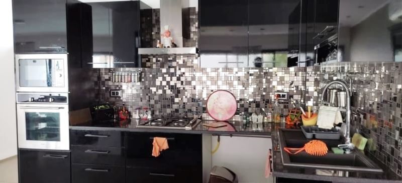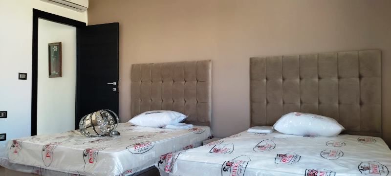 La villa est érigée sur deux niveaux, elle comporte au rez de chaussée, un grand salon qui donne sur la piscine, une cuisine équipée bien aménagée à l’américaine avec une buanderie et une salle d’eau d’invités.