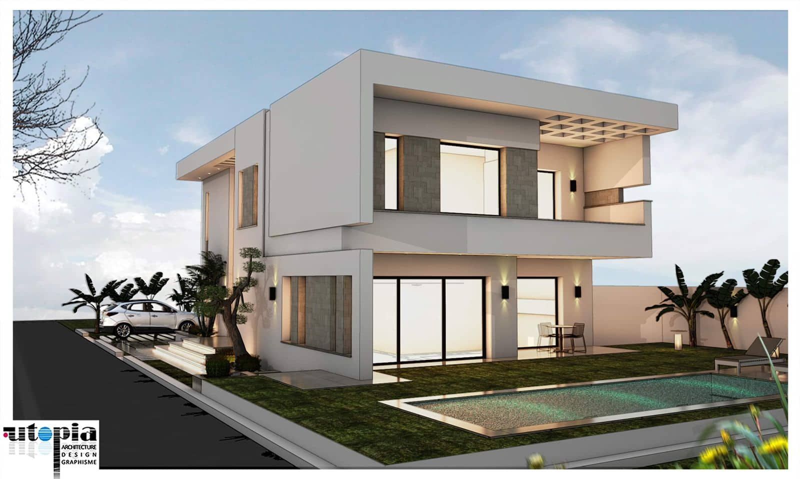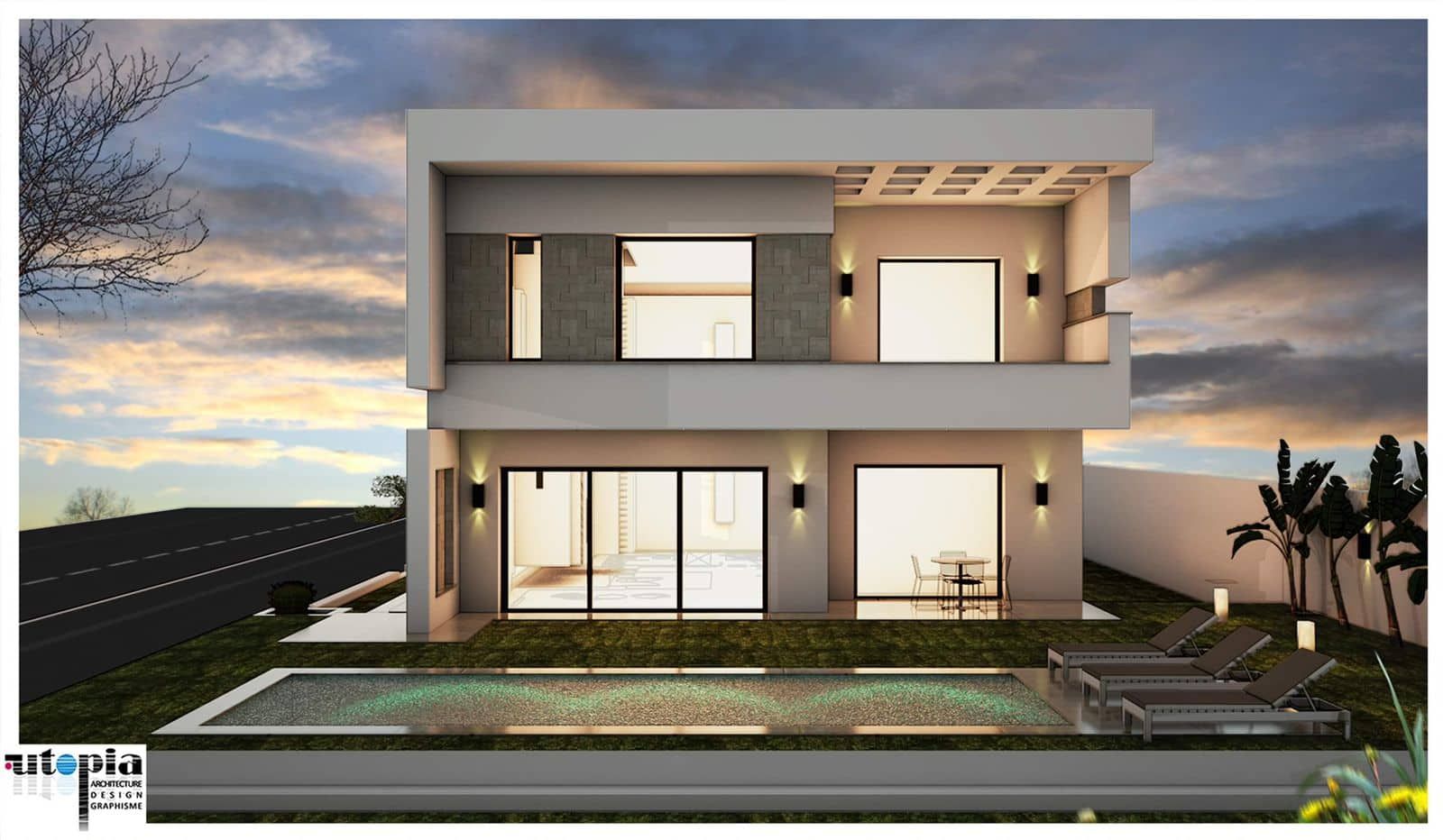 A l’extérieur on trouve une piscine et un jardin gazonné.