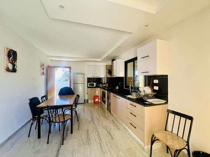 Le rez de chaussée se compose d’un salon donnant sur la piscine, une cuisine moderne bien équipée, une chambre à coucher et une salle d’eau d’invités.
