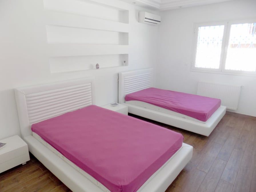A vendre chez l’agence SMART OWNER immobilière Hammamet, une belle demeure de plain pied avec un style arabesque moderne, bien située à Yasmine Hammamet dans un quartier calme et sécurisé, elle est composé d’un spacieux salon, une cuisine américaine moderne et bien installée, une suite parentale aménagée d’un grand dressing et une salle de bain, deux chambres à coucher avec des dressings et une salle de bain commune. L’entre sol compte un cellier, une chambre de service avec une salle de bain, une loge gardien, un local technique et une place parking. La propriété est équipée de chauffage central et de climatisation et elle dispose d’une belle piscine entourée d’un jardin gazonné et d’une terrasse bien aménagée.