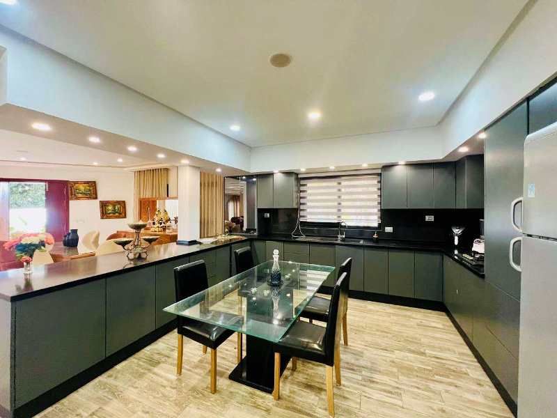 Le rez de chaussée se compose de deux salons avec une terrasse donnant sur la piscine, une salle à manger, une cuisine moderne bien équipée, une chambre à coucher, une salle de douche pour les invités et une deuxième cuisine avec un accès sur le jardin.