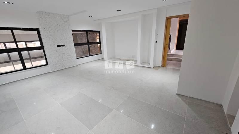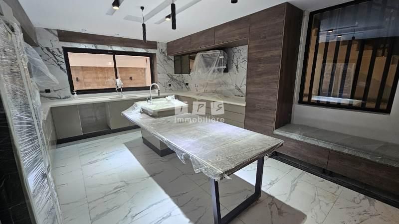 Une grande villa de type S+6 de très haut standing, qui se compose au rez de chaussée d’un vaste salon-salle à manger en double hauteur très lumineux, une suite, une salle d’eau pour les invités et une belle cuisine avec un ilot central.