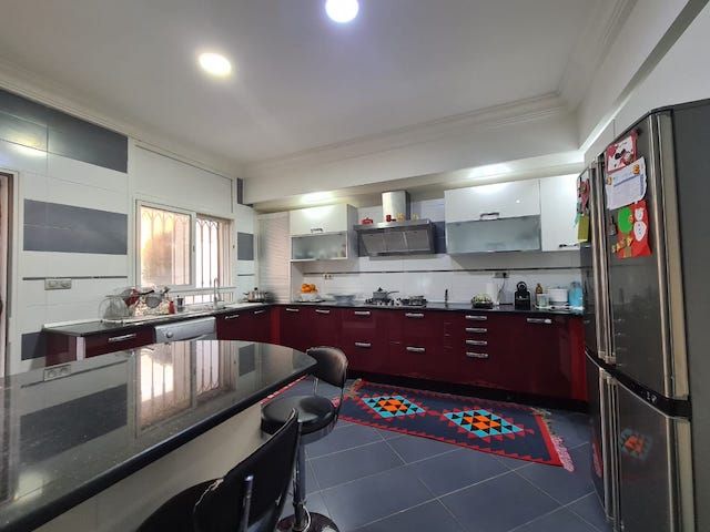 Bâtie sur un terrain qui s’étend sur 1 200m2. Elle est érigée sur trois niveaux et offre au rez de chaussée, une grande partie jour composée d’un double salon, une salle à manger, une cuisine moderne bien répartie et une salle d’eau invités.