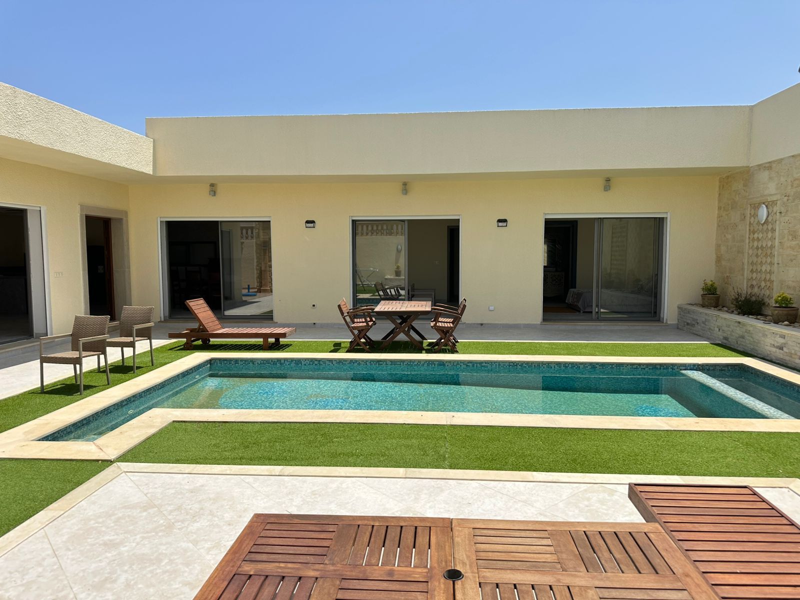 A vendre une charmante villa S+4 plein pieds avec piscine située à Boufichaa, loin 5min à la plage et 10 min par voiture à Hammamet Yasmine.