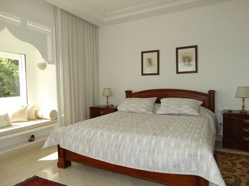 Quant à l'étage il y'a une suite avec un balcon, une deuxième suite parentale avec une grande salle de bain et une belle terrasse aménagée avec un escalier privé donnant sur la piscine et le jardin, cette terrasse sous forme d'un solarium, est un chef-d’oeuvre, bénéficiant d’une vue dégagée sur toute la ville d’hammamet avec sa plage et les environs avec une vue panoramique sur les collines et les vergers.