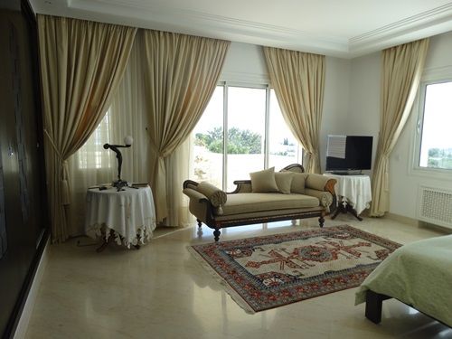 Quant à l'étage il y'a une suite avec un balcon, une deuxième suite parentale avec une grande salle de bain et une belle terrasse aménagée avec un escalier privé donnant sur la piscine et le jardin, cette terrasse sous forme d'un solarium, est un chef-d’oeuvre, bénéficiant d’une vue dégagée sur toute la ville d’hammamet avec sa plage et les environs avec une vue panoramique sur les collines et les vergers.